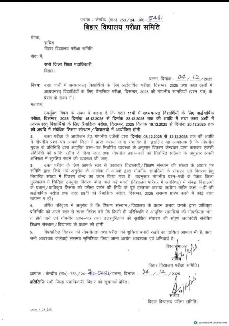 🧐 क्यों है यह परीक्षा ख़ास? बोर्ड के सचिव ने सभी जिला शिक्षा पदाधिकारियों को निर्देश दिया है कि परीक्षा पूरी तरह से कदाचार मुक्त (Cheating Free) और गोपनीय तरीके से होनी चाहिए । प्रश्न-पत्र (Question Papers) बहुत ही सुरक्षा के साथ जिला मुख्यालयों में दिनांक 08.12.2025 से 12.12.2025 के बीच पहुँचाए जा रहे हैं । इसका मतलब है कि तैयारी में कोई कमी नहीं होनी चाहिए!